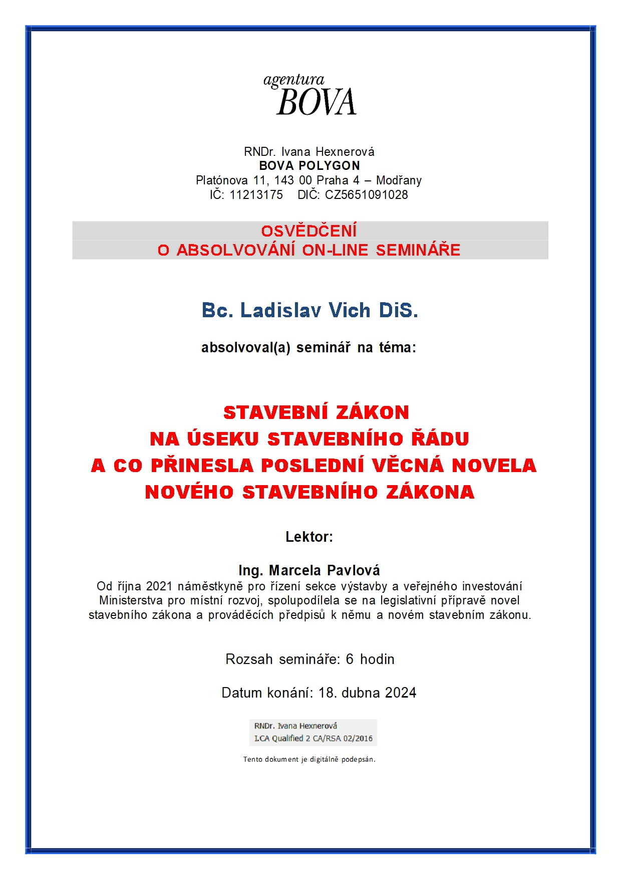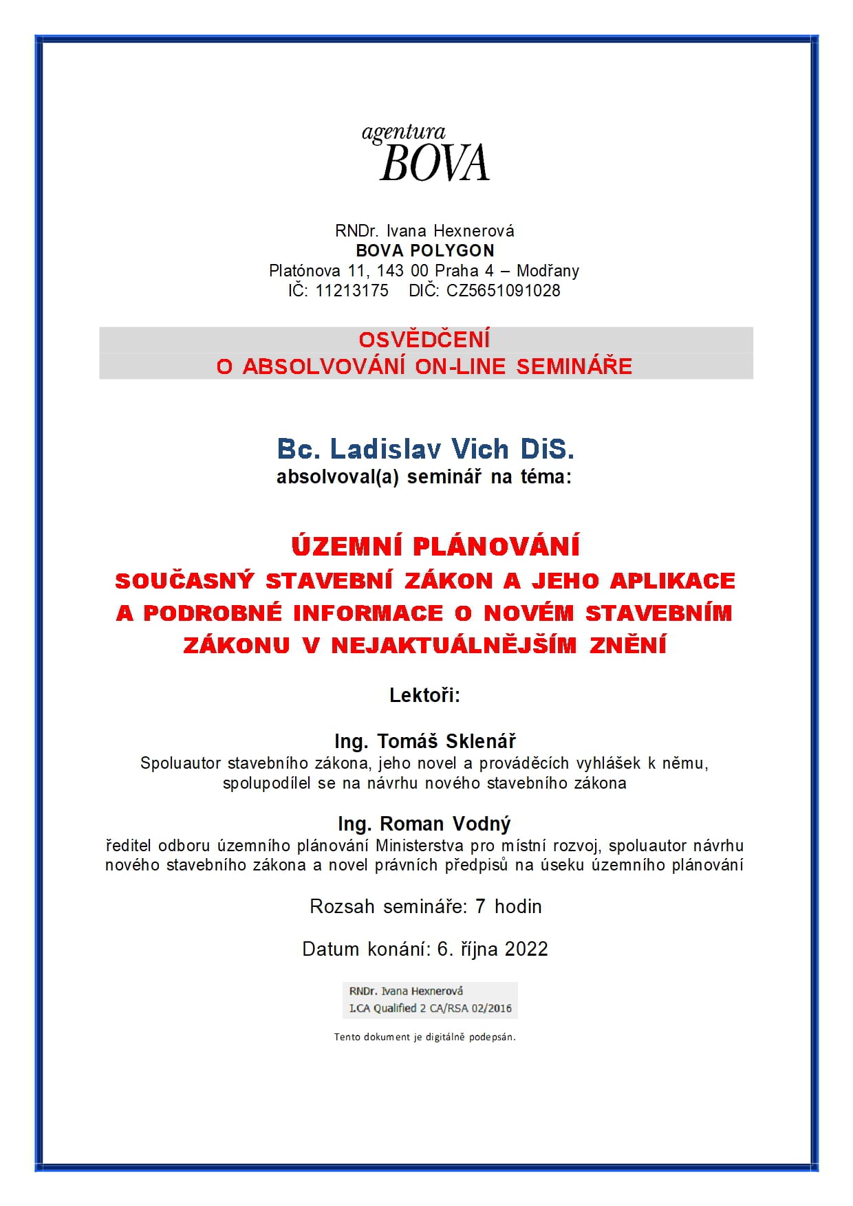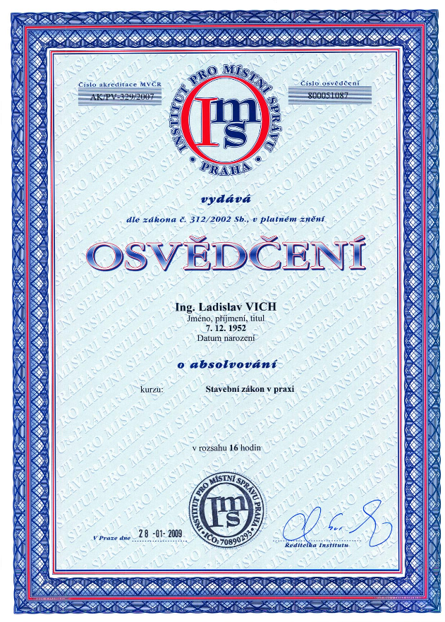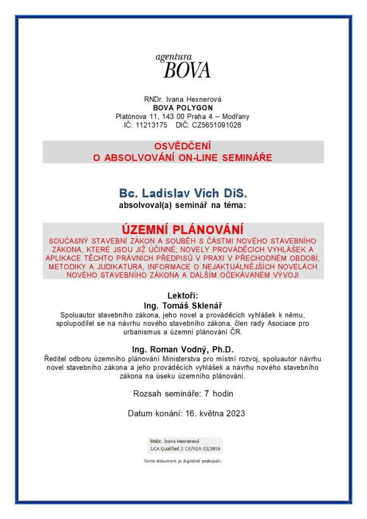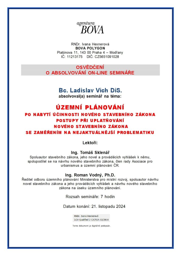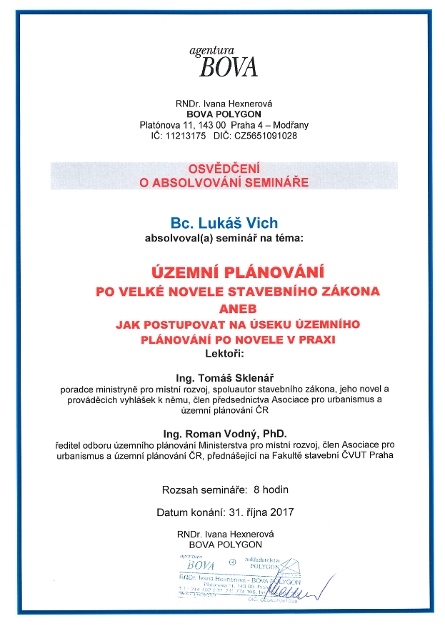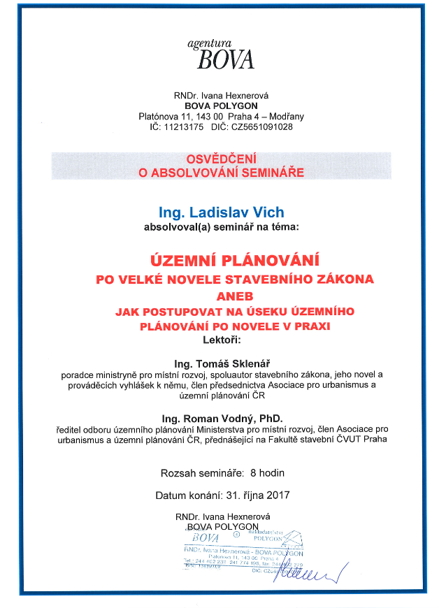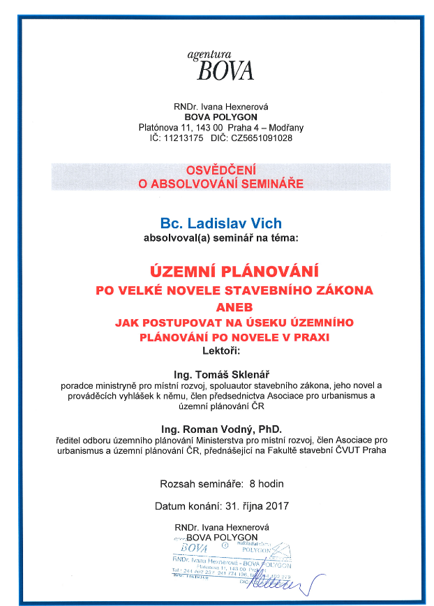O absolvování semináře na téma územní plánování současný stavební zákon jeho a aplikace a podrobné informace o novém stavebním zákonu v nejaktuálnějším znění