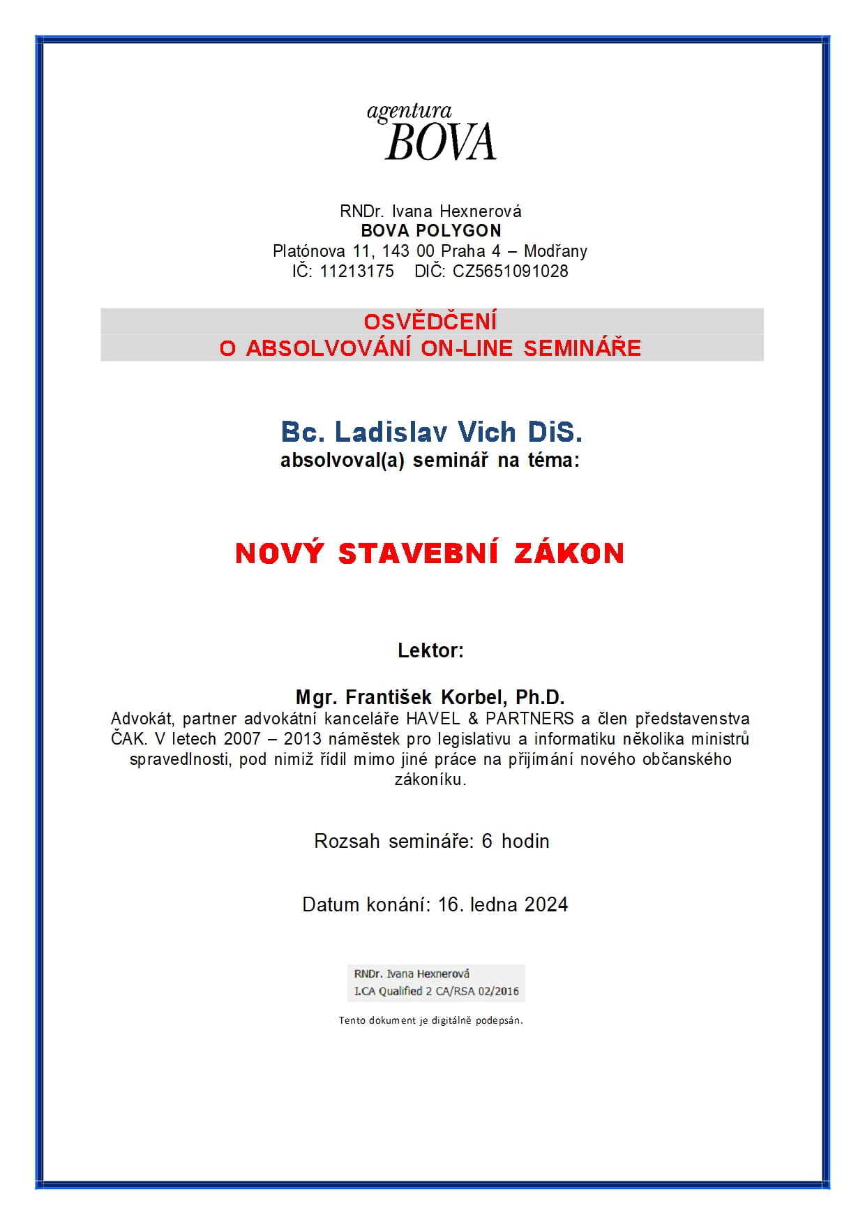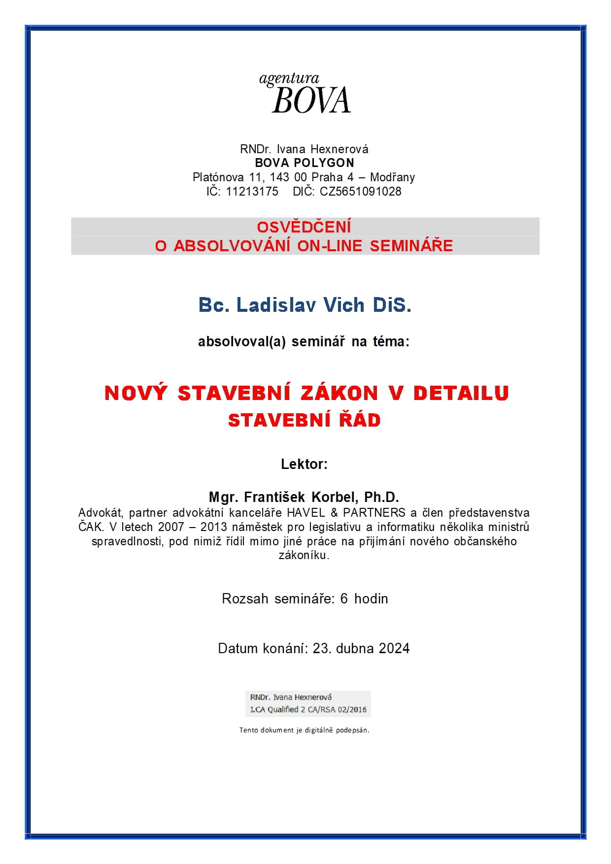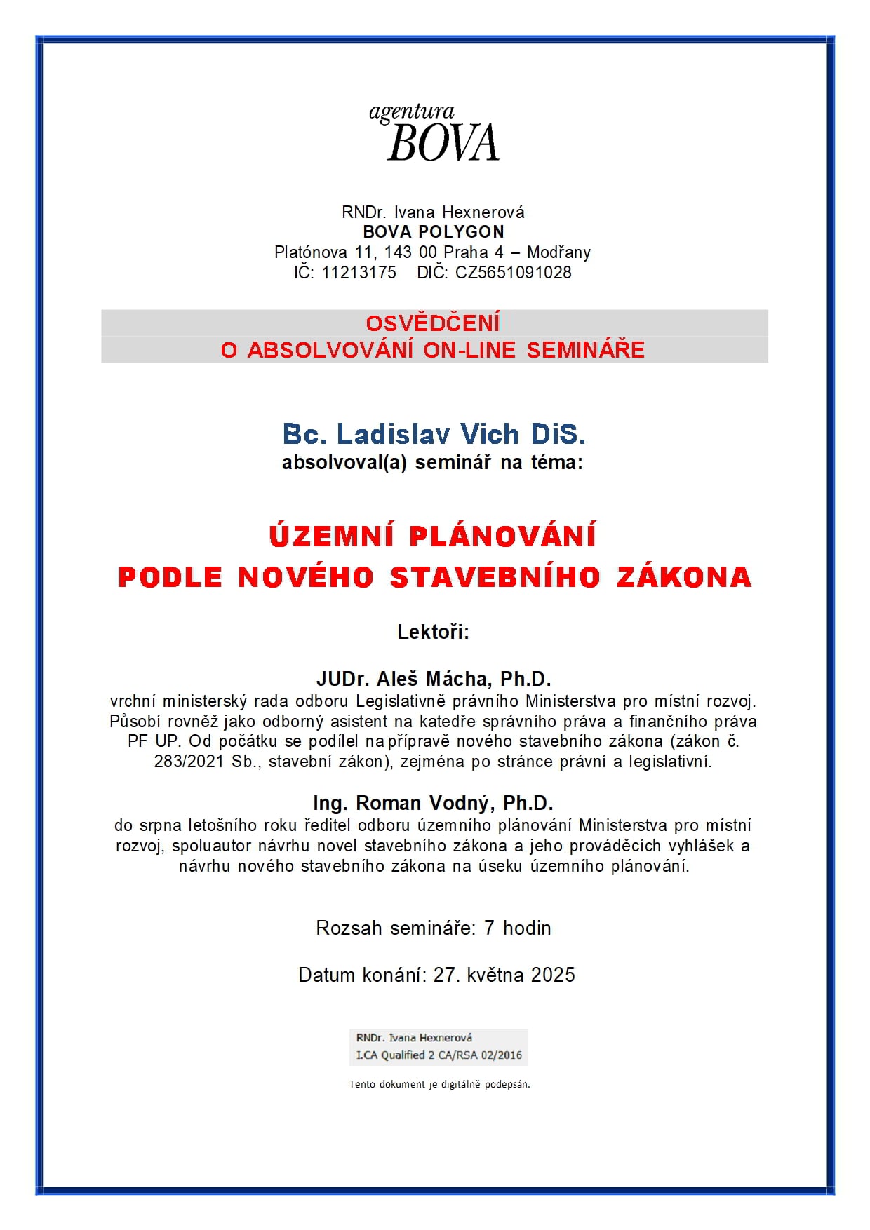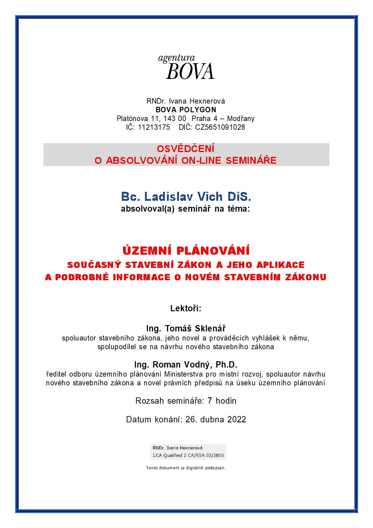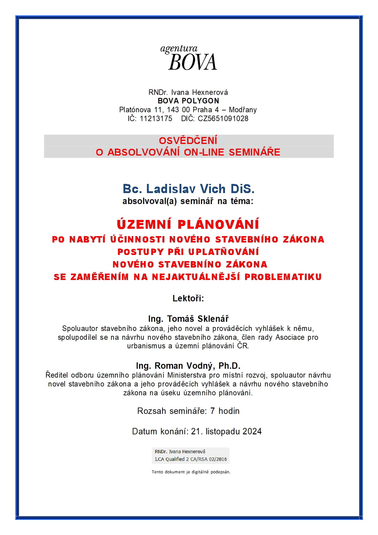O absolvování semináře na téma územní plánování současný stavební zákon jeho a aplikace a podrobné informace o novém stavebním zákonu v nejaktuálnějším znění