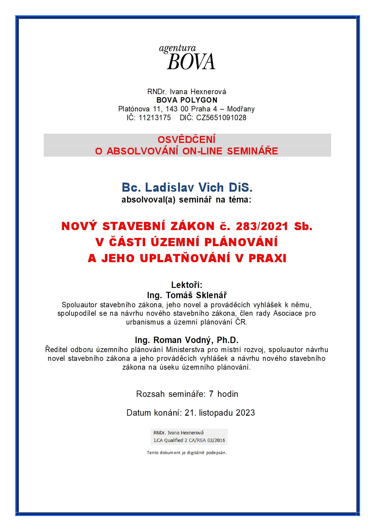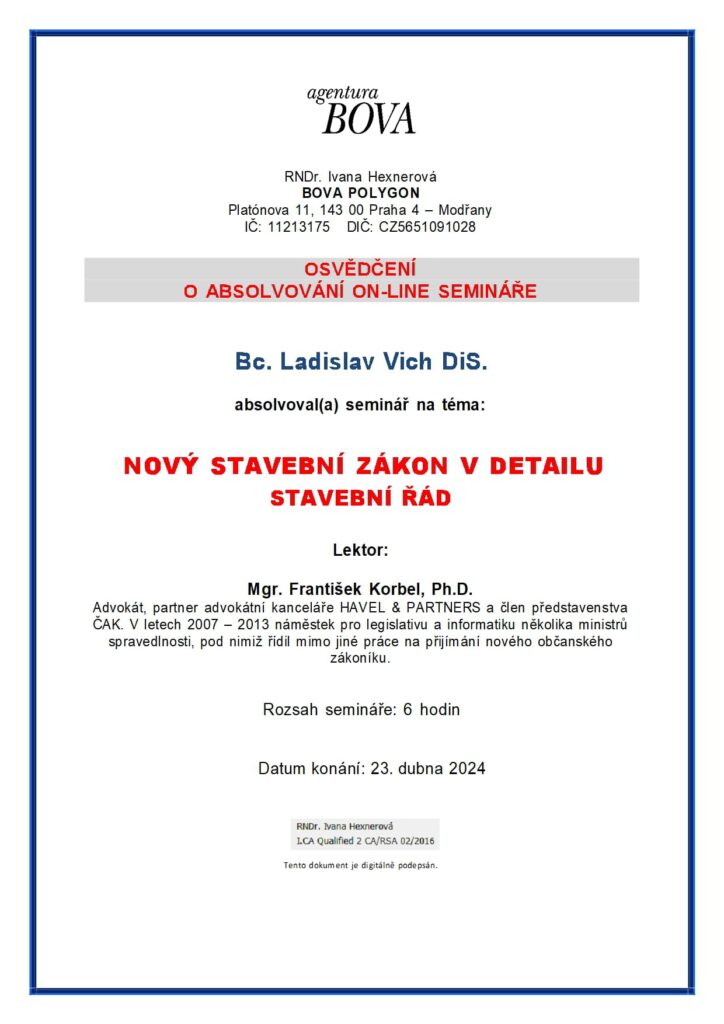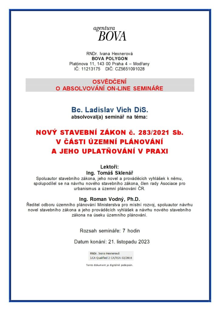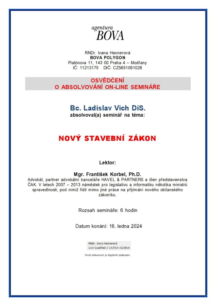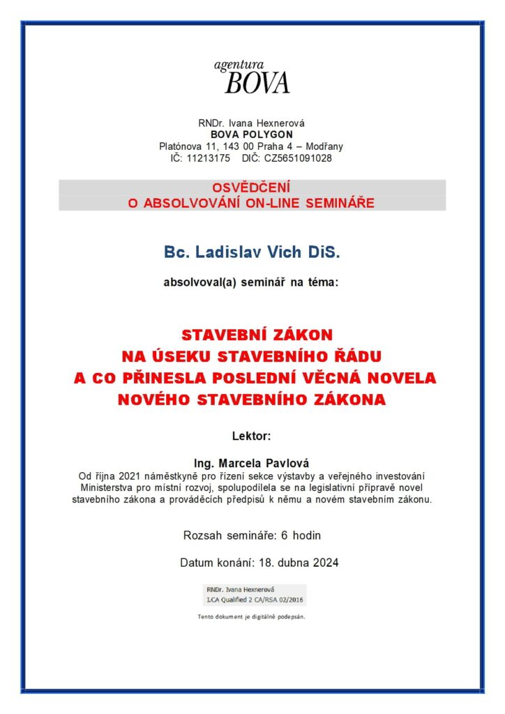 O absolvování semináře na téma nový stavební zákon č. 283/2021 Sb.